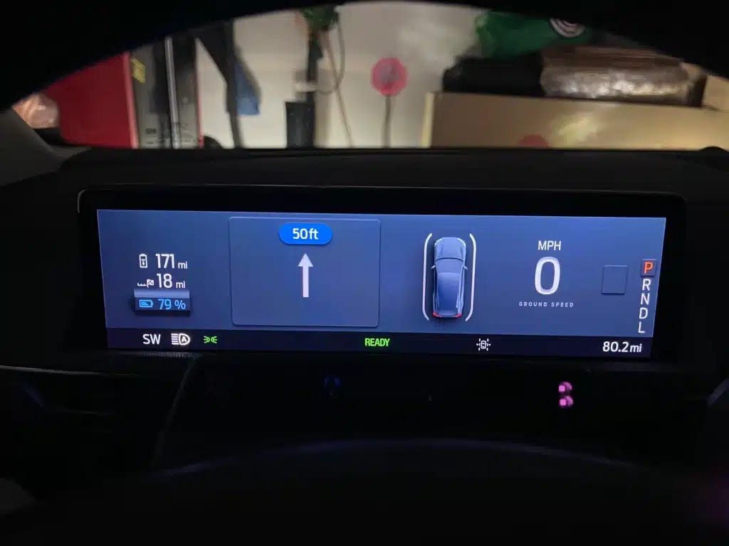 First, the car is able to pull data from Google Maps to show on the small instrument cluster just above the steering wheel, like this example showing “50ft”. That integration is nice.
